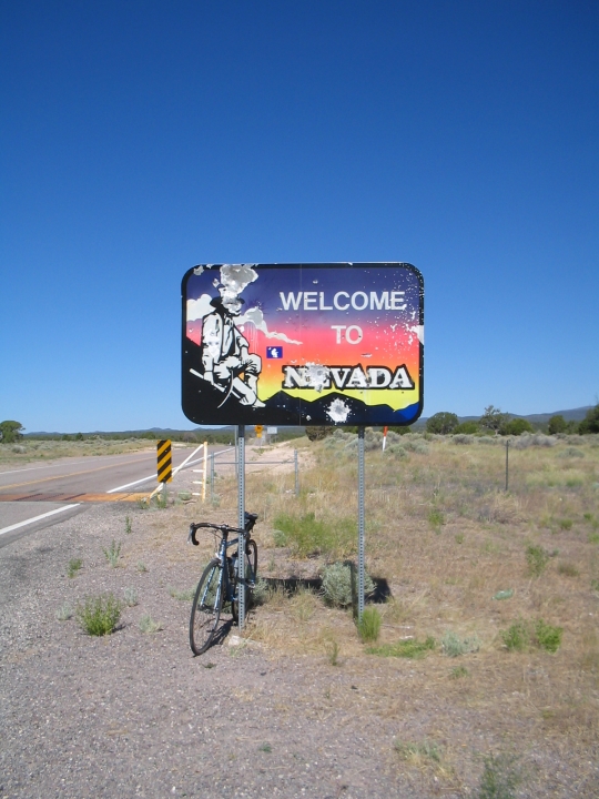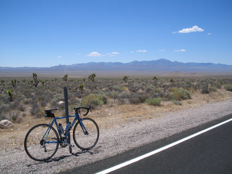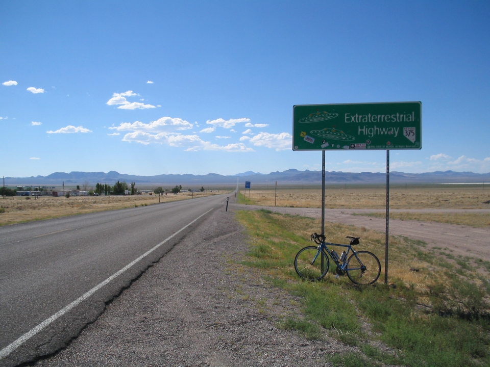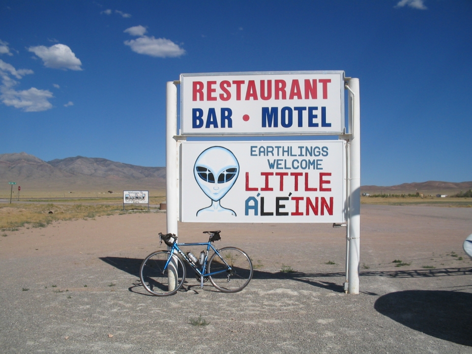 There was some intense climbing that day, the kind where you keep coming up to corners hoping that it's downhill around the next corner, only to see it get steeper instead. Very dry and very hot. We mostly took a road called the Extra-Terrestrial Highway, since it runs near Area 51. When you got into town, the "Welcome to Rachel" sign says "Population: Humans 86, Aliens ?"