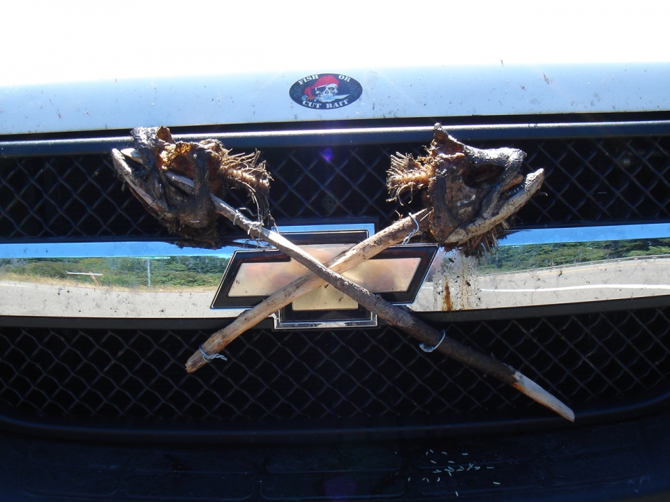 Our ride into the Redwood Forest was stunning. Huge trees and lots of green everywhere you looked. A lot of people told me that the ride to Eureka the day before was much the same way, so I was sorry to have missed that in a car. At our first aid station, we found a few fish heads on the ground and weren't sure what to make of it. Andrew and Hap came up with the brilliant idea to put them on sticks, cross them, and attach them to the grill of the van. It looked sweet.