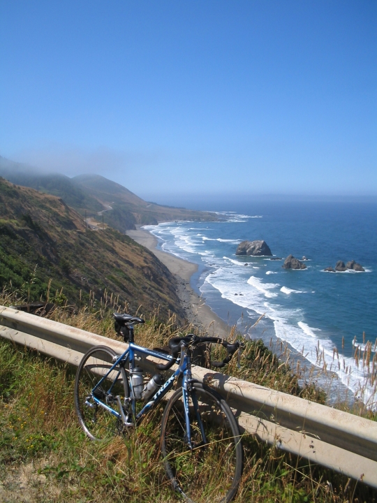 We only had 40 miles to go the next day into Mendocino, and it was our halfway day! In celebration of that, our drivers Jeff and Jen read us a halfway day rap they'd made up the night before. It was pretty bad, but it got a few laughs and we started the day in high spirits. Due to the lack of mileage, we got to Mendocino early, where we were staying at a campsite. Just as I pulled in, I hit some wicked gravel and skidded out for my first crash of the trip. Somehow I got a bloody knee through my leg warmers, which showed no damage at all, and my right shifter cap popped off. I guess I'm just not as tough as my leg warmers. I still felt fresh after only 40 miles, and got the idea that every day, my total number of miles ridden and minutes run should be 100 or more, so I went for a one hour run. Along the way I got to see a farmer's market in town, old downtown Mendocino, a library with no internet, and some cool beachfront areas. The beaches up there are pretty rocky, and there are lots of places where the waves slap right up against the rocks. I found some spot where the rocks made a U that was so tight it nearly closed at the mouth. The sides went straight down and the water inside it was calm. I sat with my legs dangling over the edge of the U and just watched the water for about half an hour. Later I found a hole in the ground where the walls again went straight down to make a completely enclosed pool. Unfortunately, it was fenced off from a few feet away, so you couldn't see down in it.