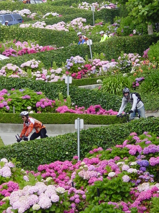The place we were staying wasn't really in town; it was actually on the north side of the bay. Since we'd all wanted to ride across the Golden Gate Bridge, we drove the still-loaded trailer back into the city and started there. First, about half of us wanted to go down Lombard Street. We started making our way there and had to climb one hell of a hill to get to it. Every block of the street got steeper and steeper, and by the end, I was in my lowest gear, standing on my pedals, and really using some muscle, but still moving very slow. The grade was estimated to be greater than 20%, or more than twice as steep as Tioga Pass. Once at the top, we moved over one block to descend Lombard Street, where I was surprised to see my dad standing at the top. He took a photo of me at the top, and another on the way down. The thing was so steep and twisted that we had to go down one at a time on about ten second intervals. I had forgotten to tighten my brakes again when I put my wheel back on after taking it off the trailer, so I was squeezing my brakes until they touched the handlebars, and I still wasn't slowing down enough. Running out of options, I started dragging one foot as I went down, which completely wore out the toe of one shoe. At the bottom, there were my grandparents and my mom. The whole gang had turned out for me. They got my picture in front of the street, then I got one of Invictus at the same spot.
