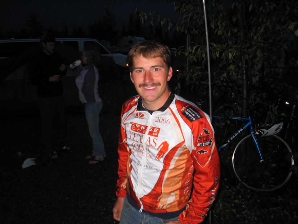 We were staying at a YMCA that night, which had showers and a steam room. The hot shower felt great, and a lot of my teammates that got caught in the late rain spent a long time in the steam room. We all felt better after a while. One of us had gotten the idea that all the guys on the team should have "Morale Moustaches." Pretty much all of us had at least some facial hair at that point, so we shaved ourselves a moustache. But just for good measure, one of us went to the store and bought some Just For Men, the darkest color available. We all now had jet black moustaches, regardless of the color of hair on our head. It didn't look good on everyone.