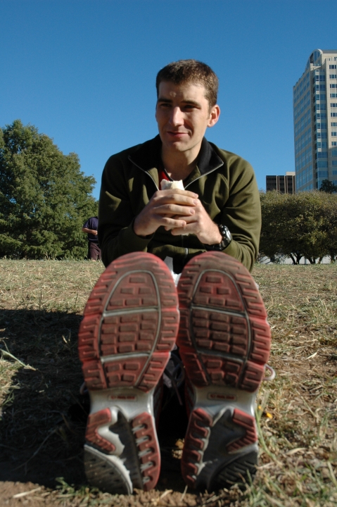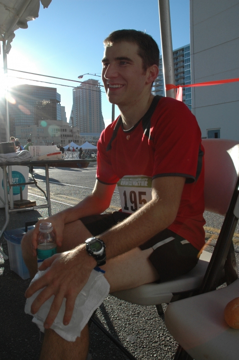 I woke up on a cold morning at 5:30 AM to shove down a banana and Clif bar, then quaff some orange juice and Cytomax, hopefully ahead of time enough to have them settle in my stomach before the race. I put on some wind pants and a jacket, then headed out the door with Peyton as my trusty driver.
