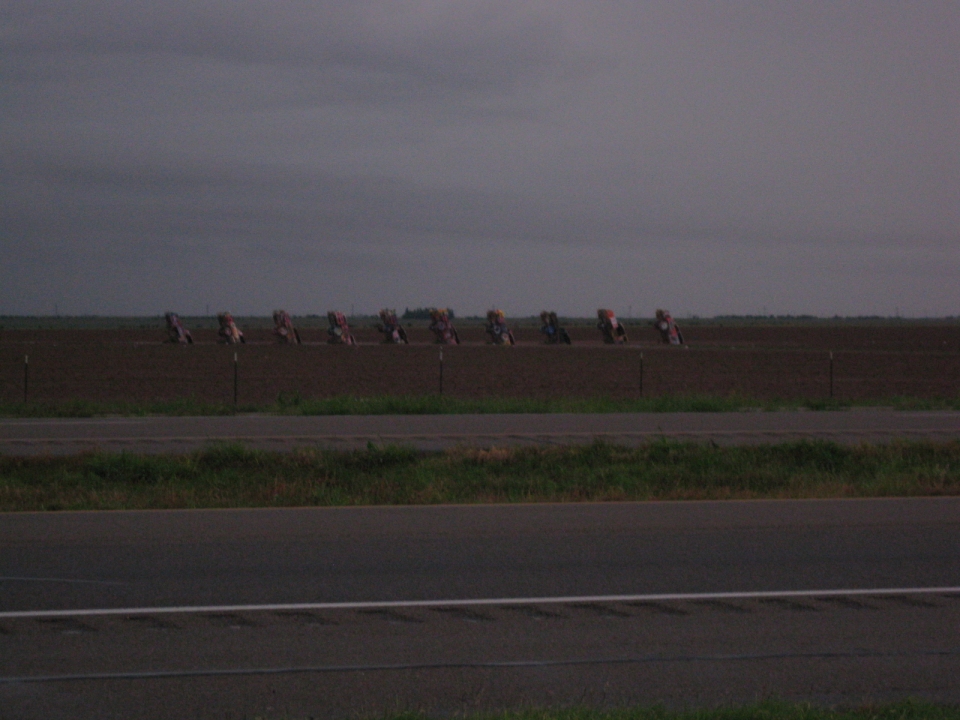It was raining lightly when I hit the road this morning, so I put on my waterproof jacket. The rain started dying out right away, then disappeared after only a few miles. Rode past Cadillac Ranch, though it was on the other side of the highway. Going all the way around just for a good picture would add two miles. It was starting to rain again, so I decided against it. Besides, I've seen it before.
