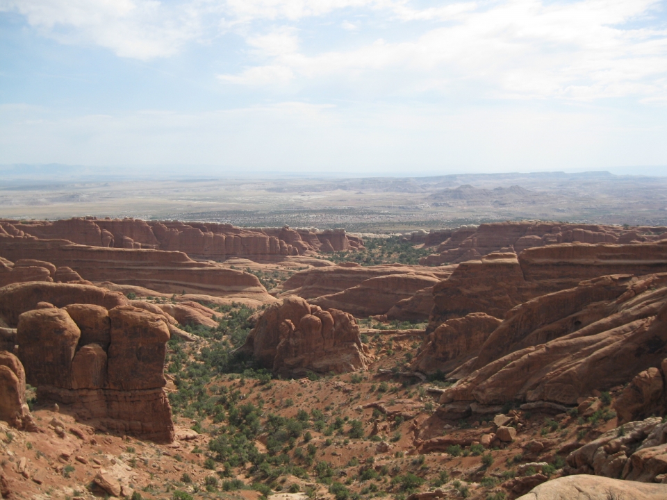 Turned south towards Arches on a road that was flat at first and gradually got a little hilly. Absolutely no human establishments on the way, with the exception of a single gas station. Right before getting to Arches, descended into a canyon and got some nice views. But the best was yet to come.