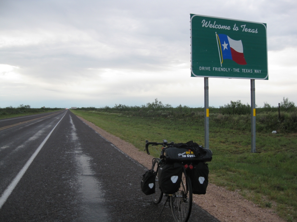 Rained last night. Road still wet and clouds still threatening. Didn't get rained on, but it stayed dark for a while. Crossed the Texas state border at mile six. Last one. Feels good to be back in Texas!