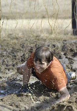 I got there about an hour early, since previous emails had said to allow up to 45 minutes to get registered. Apparently since I had already done it online, and had already signed my death waiver before coming, it only took about 10 minutes. Got my bib and pinned it on, but since the mud often obscures it, you have to get your bib number written in permanent marker on your forehead and either your arm or leg. Got that taken care of and still had 45 minutes before the race started. Went and checked out some of the course. The folks there were busy hosing down the mud pits one more time to make 'em extra sloppy, and were even adding bags upon bags of ice into all the pits of muddy water.