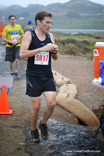 Crested the hill and entered a eucalyptus forest. The wind was pushing the fog into the trees, which were collecting the moisture and dripping onto the forest floor. It was like it was sprinkling, and the trail had turned to mud. I laughed and turned to the guy next to me, "Bet you didn't know this was a mud run, huh?"