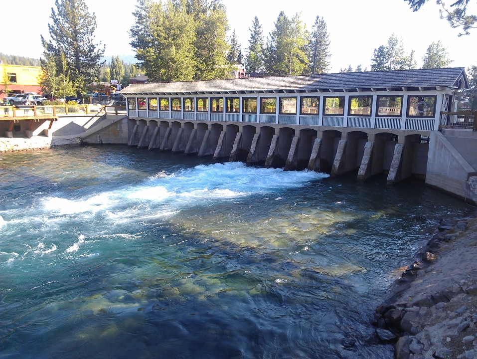 For the next several miles, virtually flat, almost no traffic, and no other bikes either. Basically a lot of trees, easy moving, and good views of the lake, until I got to Tahoe City. All of a sudden, the traffic picked up, and I started seeing other bikes too. Tahoe City also happens to be the location of the dam that holds in Lake Tahoe.