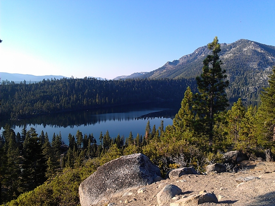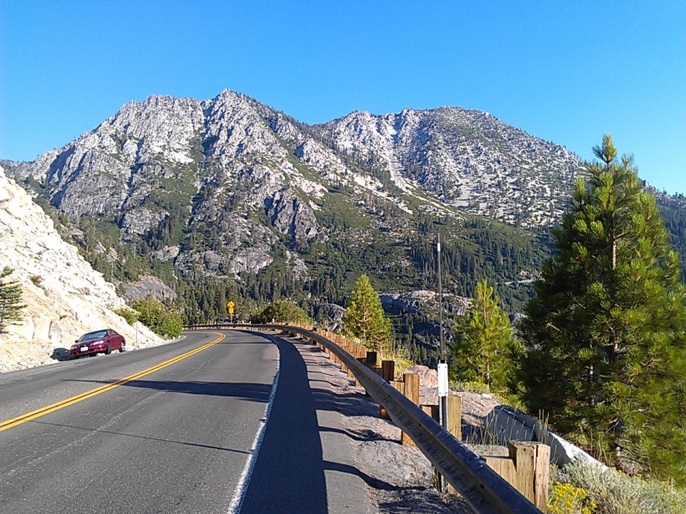 I started early, about 6:45 AM, descended the giant hill to get to the main road (getting rather cold in the process), and headed around the southern end of the lake first. After seeing all the summer tourist traffic the day before, I wanted to get through South Lake Tahoe (the biggest city on the lake) and Emerald Bay (the most popular scenic point on the lake) as early as possible. Luckily made it through with little traffic. Saw a few other bikers heading up the hills to Emerald Bay. Most of them passed me, because I kept stopping to take pictures.