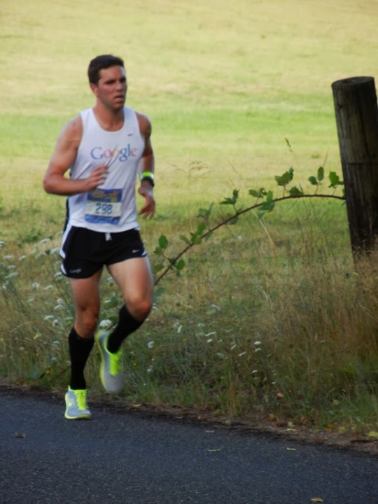 The hill finally reached a flat spot, then the course went up an incline towards the exchange. Everyone else slowed to a crawl, adjusting to the different terrain, waking up their climbing muscles. I annihilated the field for a quarter mile. Oh trail running, I love what you have made me. Suddenly, I saw volunteers and a ton of cars. This must be it! The volunteers guided us through a twisted path through a parking lot, in such a way that I could never tell how far away the actual exchange was, so I never got to a full sprint. When I could finally see it coming, there were a ton of spectators all over the place, mostly other runners, also wearing singlets and running shorts. I couldn't pick out which ones were waiting for the baton, and definitely couldn't tell which one was John, until it was essentially too late to bother sprinting. I ran hard to the finish, finally spotted him, and passed it off. He took off with astounding speed. I turned around and started walking towards where I figured my teammates were. I finally noticed I was sweating.