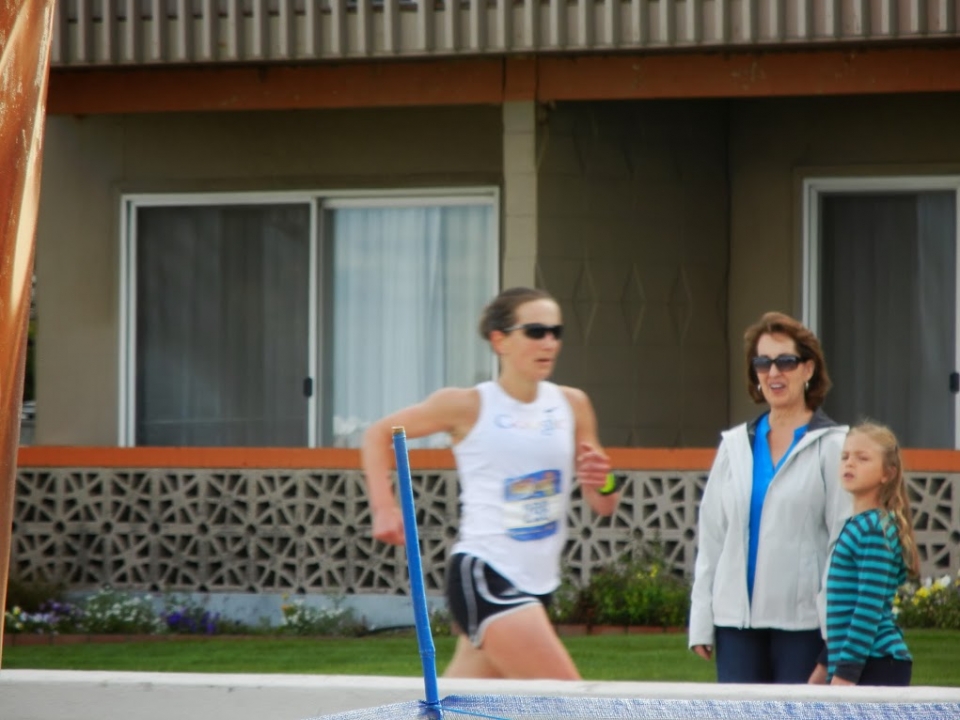 "She's coming!" We lined up in a chute, and two minutes later, saw Angie blazing down the boardwalk. She just kept getting faster and faster as she went. She crossed the timing pad, turned to her left, and held on to a rail, panting.