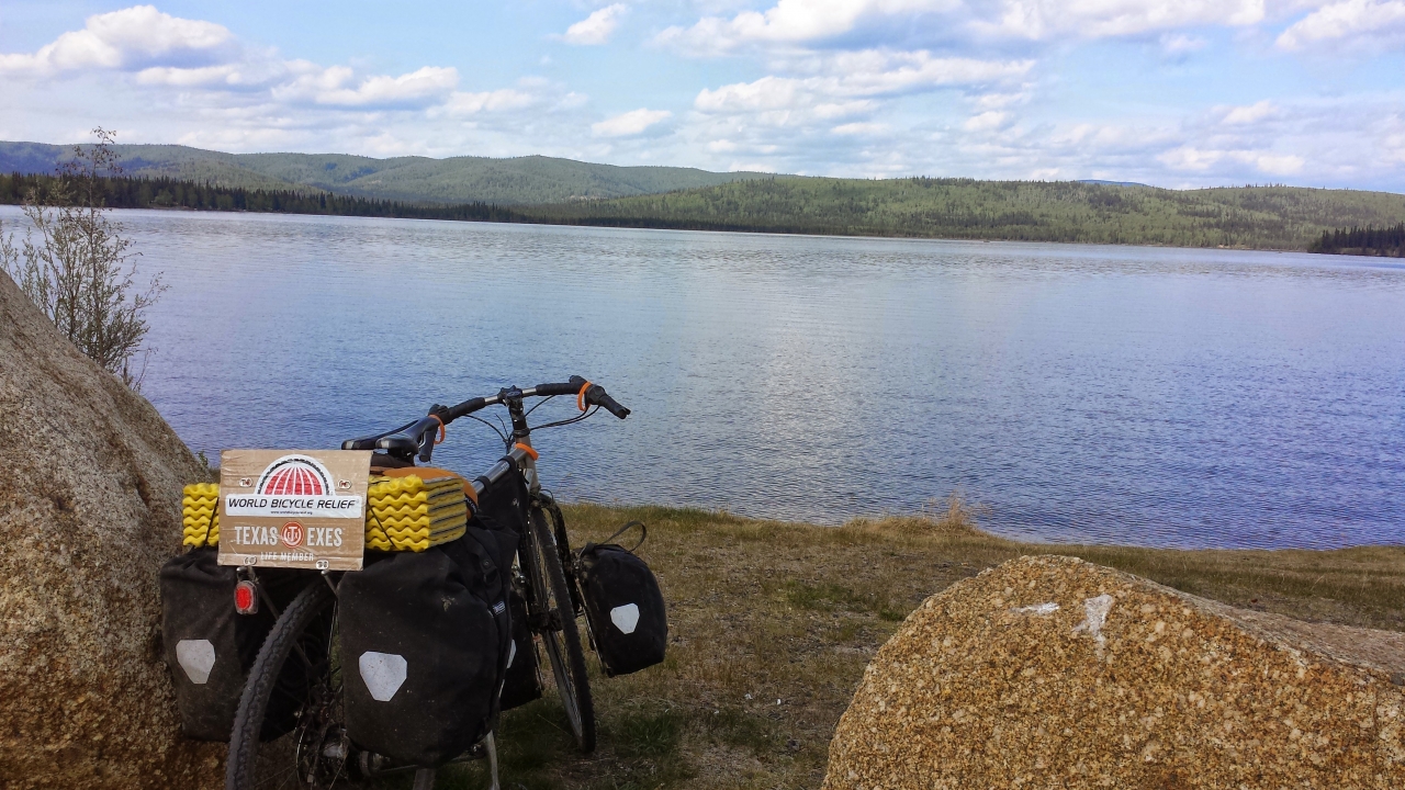 Before I left Fairbanks, Patrick helped me set up a sign on the back of my bike. Decals don't stick to the fabric my panniers are made of, so we had to get creative with a piece of cardboard, plenty of clear packing tape, zip ties, twist ties, and four soda can tabs. I conceptualized a good part of it on the bike (you have lots of time to think about pointless subjects on a bike tour), but some of the attachment was Patrick's idea. I gotta say, it would not have turned out as well without his help.