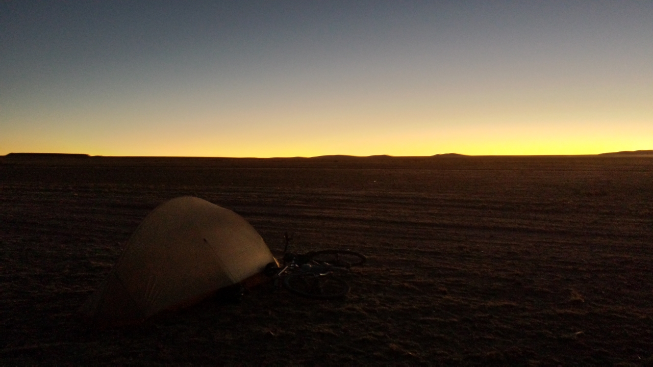 I continued a little longer and pitched my tent only about 100 m off the highway, in plain sight, since there was absolutely nothing to get behind. There had only been one car in the last hour, and now it was only half an hour before sunset. Anyone who would drive this highway at night must have a death wish.