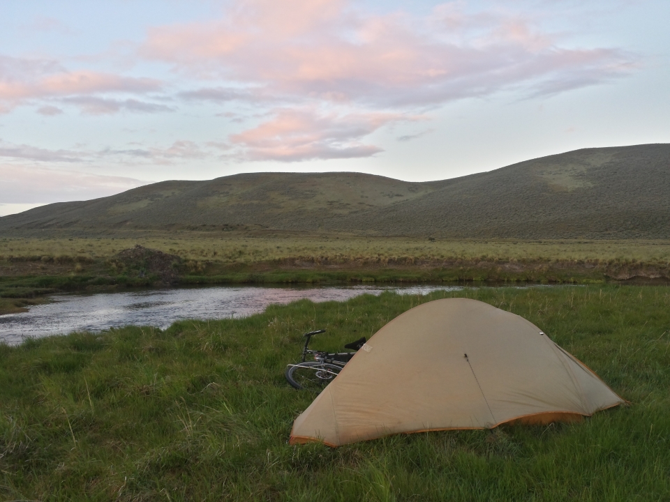 I got as far south as I could until about an hour before sunset, which happens after 10:00 PM these days. Even though there was nothing around, both sides of the highway were fenced off. Gotta protect all the nothing that no one's using! I finally found a creek, where the barbed wire had to follow the shoreline, and walked Valeria about 100 m from the highway to camp next to the bank. Almost as soon as I got in my tent, it started raining. Good timing!