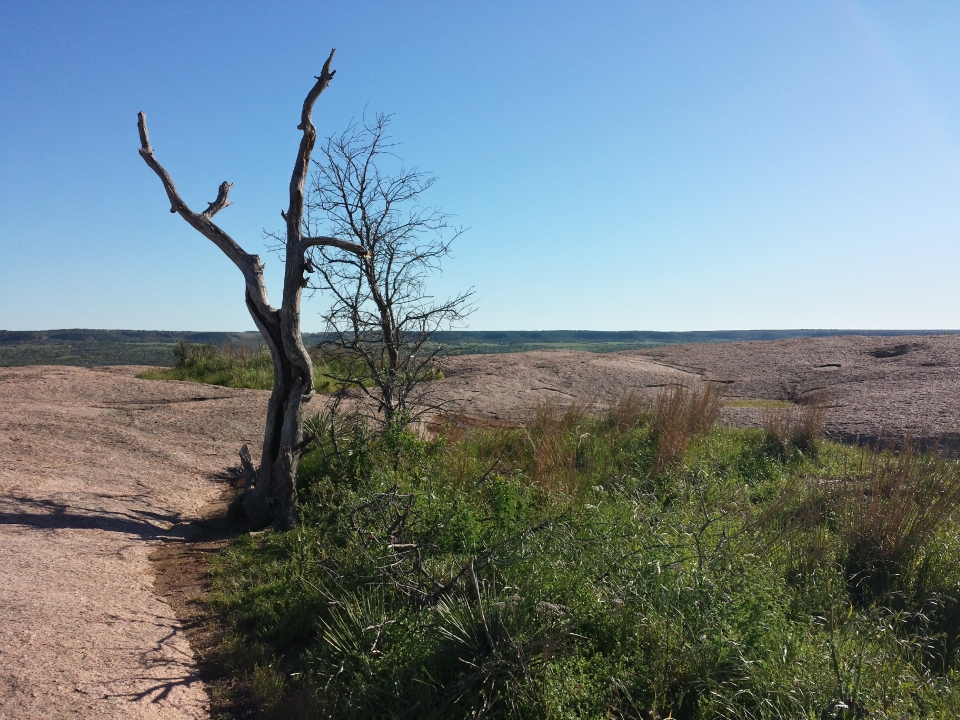 Shortly after a beautiful 30-minute drive, we were in Enchanted Rock State Park. We had no trouble securing a primitive campsite; evidently those are never in demand. We hiked the mile-and-a-half around to the other side of the rock and set up our tent underneath a post oak tree, leaving off the rainfly for the clear skies and cool air that night. Then we hiked up to the top of the rock.