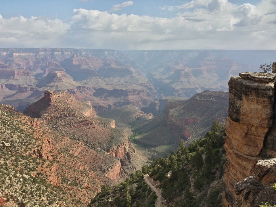 Instead of taking a bus to the trailhead, we walked there, along the rim. Most of the trails on the south rim allow bicycles, except the one with a view! Once there, you could see why - the trail is at times only a few feet from the edge, with a probably-fatal drop, and no guard rail. One swerve to avoid some kid running across the trail and that could be all for you.