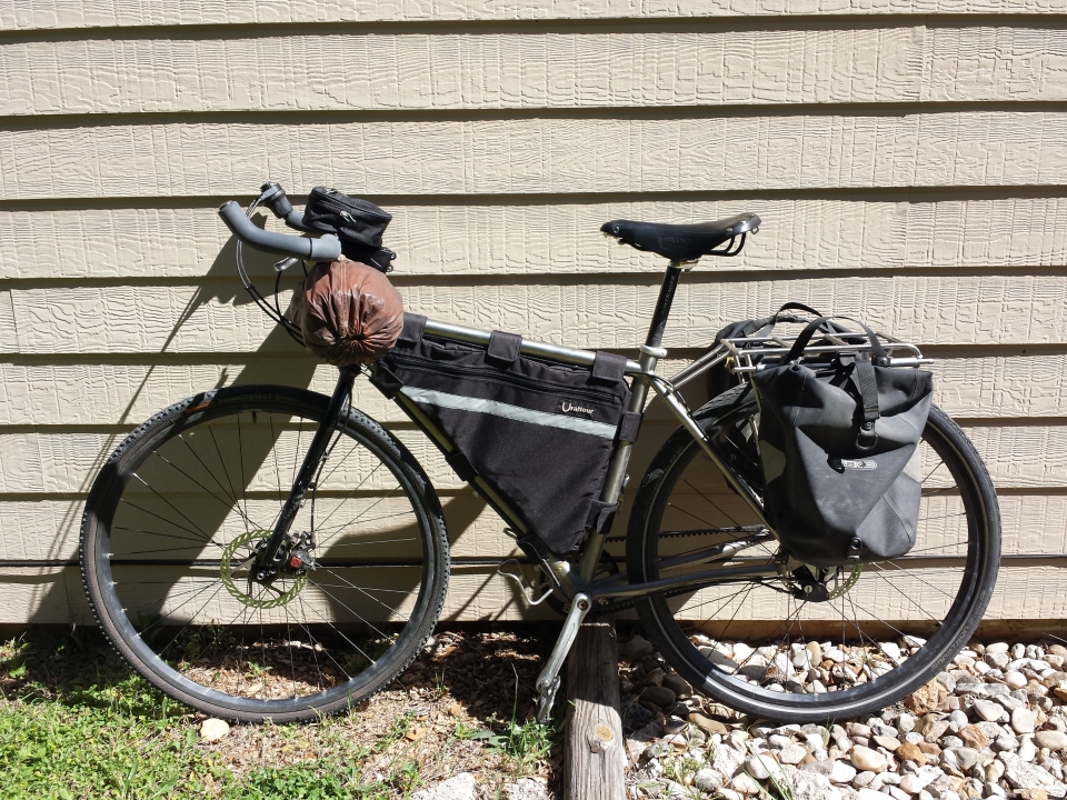 As of now, the idea is to carry my water, by far the heaviest thing you carry, in a frame bag. That puts a lot of weight in the center of the bike, and relatively low, which helps balance. I'd still carry a rack and panniers on the rear. But what to do about the front end?