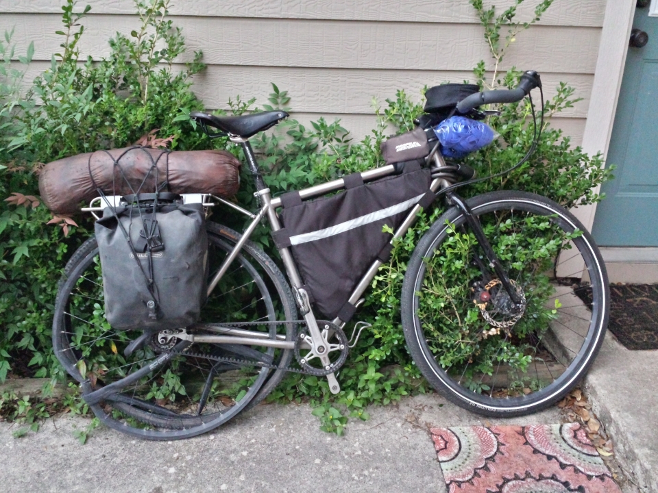 Most of the credit is due to packing more efficiently than ever before. The setup now uses only the front (smaller) panniers, mounted on the rear, a frame bag, and a few other smaller packs strapped to the handlebars. This makes Valeria a little tail-heavy, but the setup so lightweight in general, it barely matters.