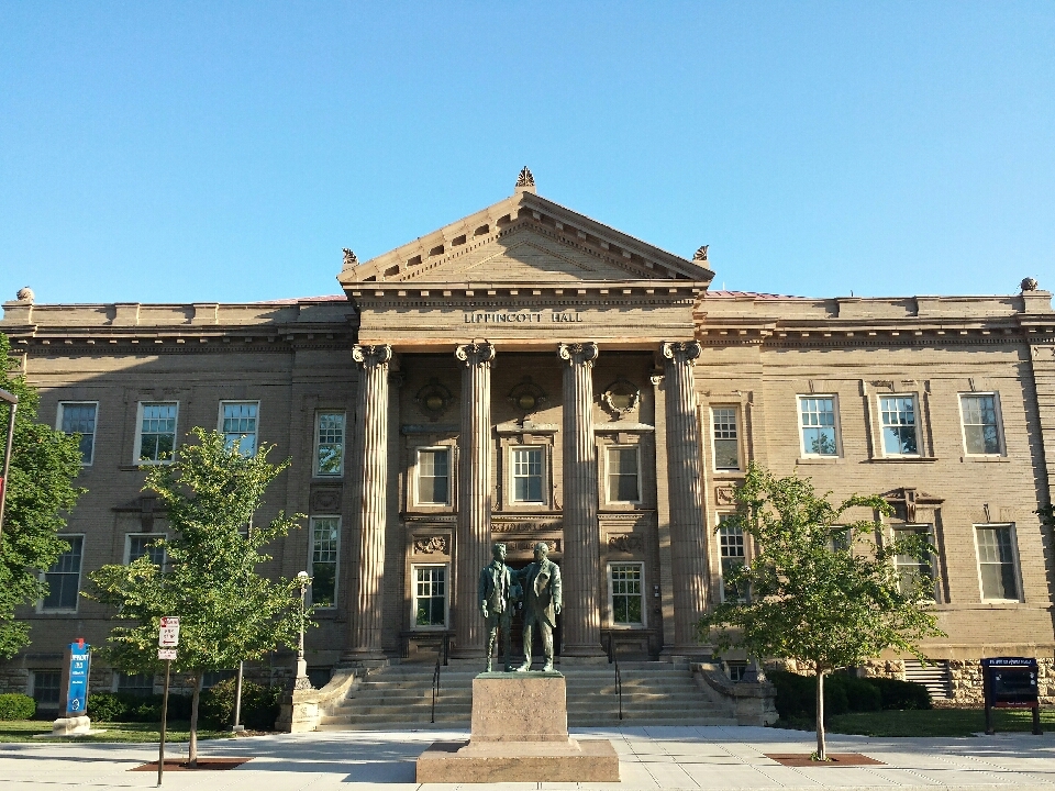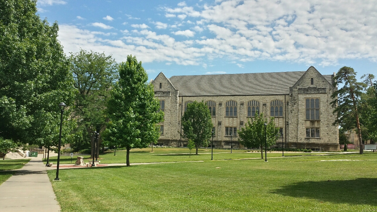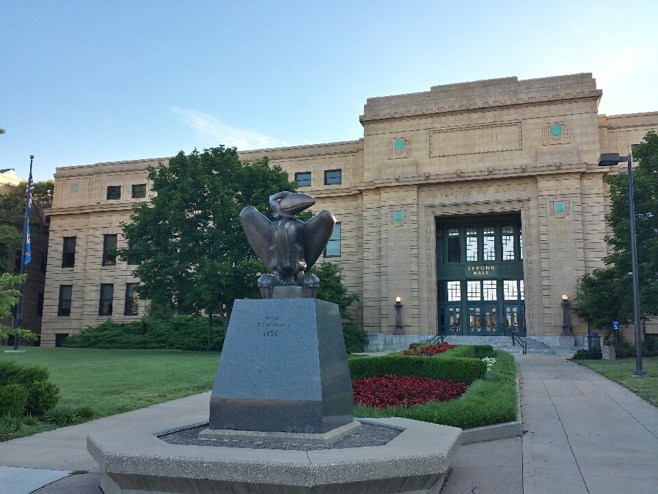 Once in Lawrence, a town even Hillier than it's surroundings, I bypassed my hosts and made my way to the Kansas University campus. It was still a dreary day, so regardless of the buildings, it was hard to find it pretty (better pictures would come later). I definitely liked how most of the main buildings are on either side of a main strip. Walking class-to-class, or to the library, must be a snap. A very student-friendly campus layout.