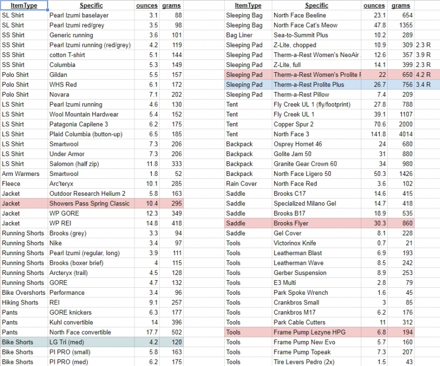 Part of what’s helped me pare down my weight is careful data collection and analysis. I’ve painstakingly made a spreadsheet cataloging the weight of every piece of gear I own (and a few I don't). Sometimes different combos of gear come out to much less than you imagine (two pairs of running shorts weigh less than one pair of hiking shorts!). Once you have the data, you can assemble several different theoretical packing lists and see what the total weight would be, or see the total effect of swapping one piece of gear for another. Doing this has made me realize what the real culprits are for heavy loads (especially bike gear), and after re-thinking the approach, it’s been possible to ditch more weight than I thought possible, all while sacrificing almost nothing.
