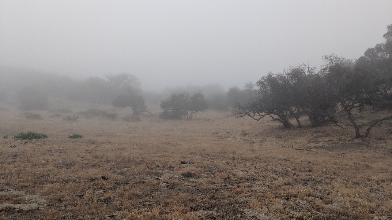 I was hoping my clothes would be dry by morning, and I had heard of a trick: If you keep wet clothes in your sleeping bag with you overnight, your body heat will dry them by morning. All it did was make my sleeping bag clammy. My clothes were just as wet in the morning. The cool, beautiful foggy morning. The world simply looks more magical in the fog.