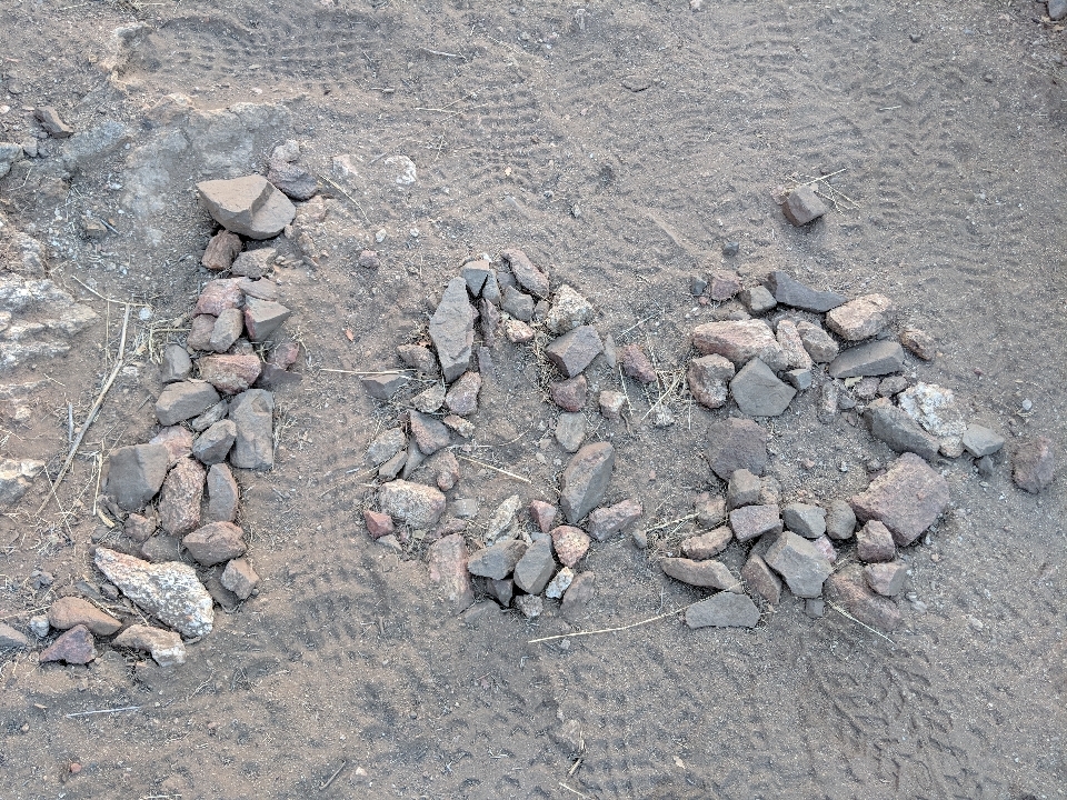 As evening was setting in, I came across the 100 mile mark. Then I crossed it again. And again. It seems as if people thought they were at the 100 mile mark on four or five different occasions and kept spelling out the number '100' with rocks in the dirt. I only took a picture of one of them.