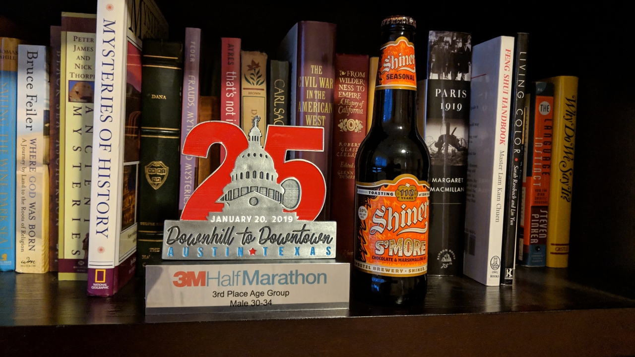 Downed a few post-race goodies, including free beer! Apparently as much as you want, but I thought better of having more than one. I had to drive home, and running gives you the tolerance of a three-year-old. Collected my 3rd place age group award, took the bus back to the start, then made the long, scenic drive back to Wimberley. I’m not sure which of my rewards I liked having more.