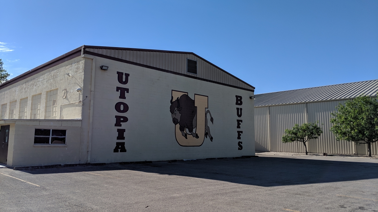Since it was right on the main street, I decided to check out the high school. From what I could tell, all of Utopia's schools are on the same schoolgrounds, and each of them was a single building smaller than a grocery store. A couple of them looked like warehouses. Utopia HS is a 1A high school (the smallest classification) and doesn't field a football team. In Texas, that's unheard-of.
