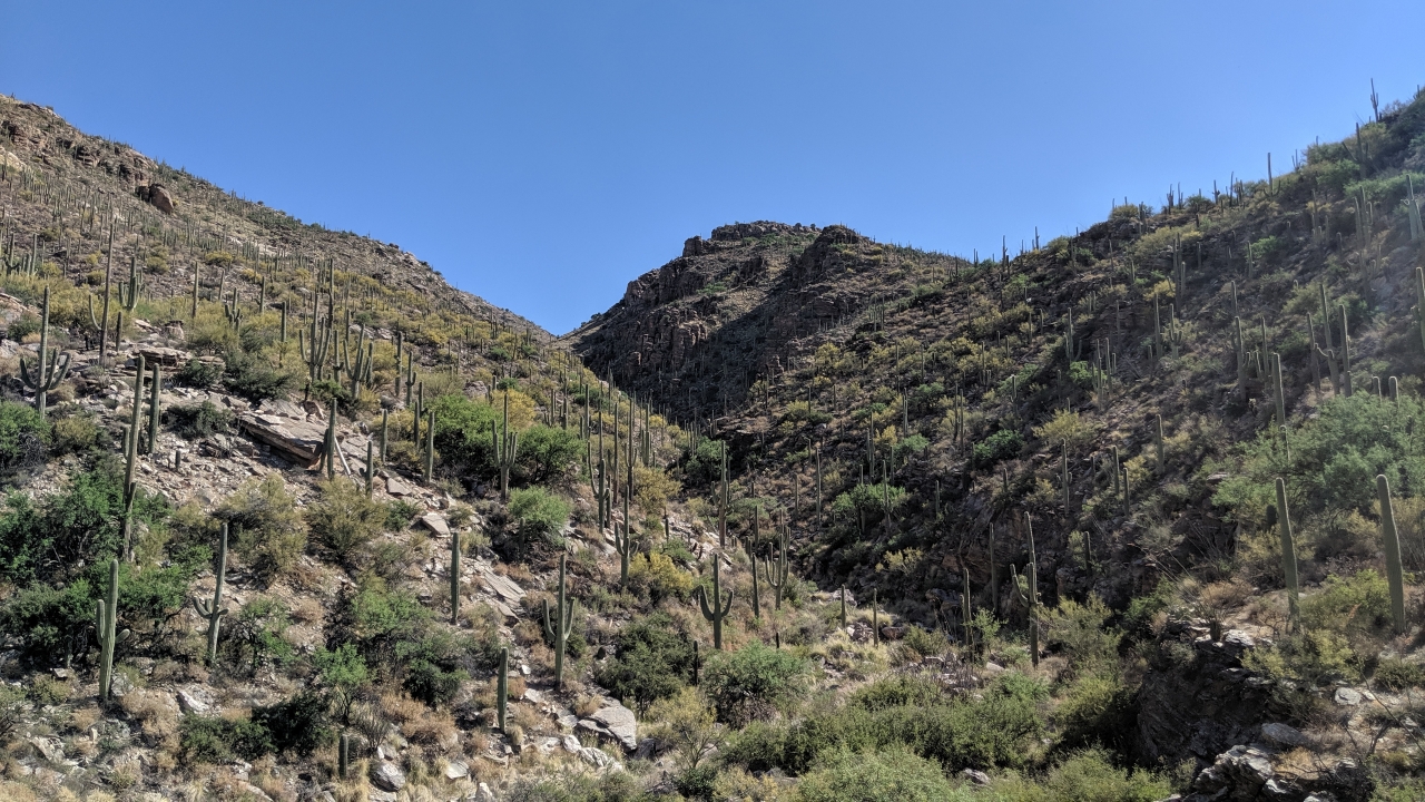 At the beginning of the climb, the hills were covered in saguaro cactus. Up close, they look like they do in roadrunner cartoons. From farther away, it looks like the hill has stubble and needs to shave.