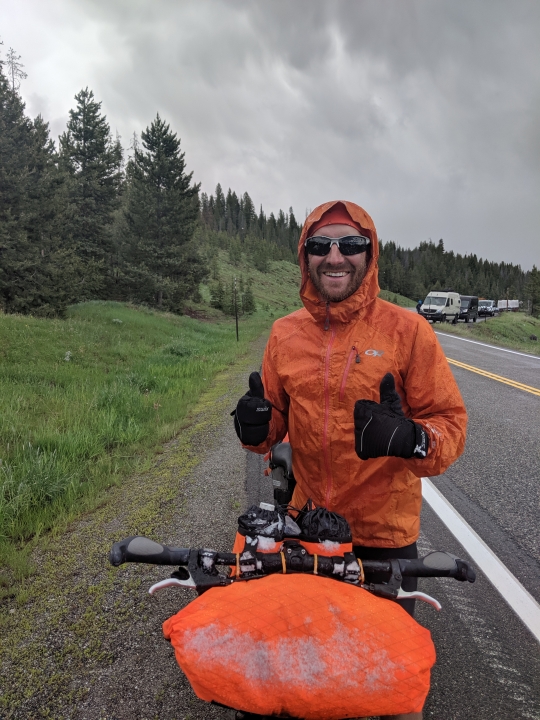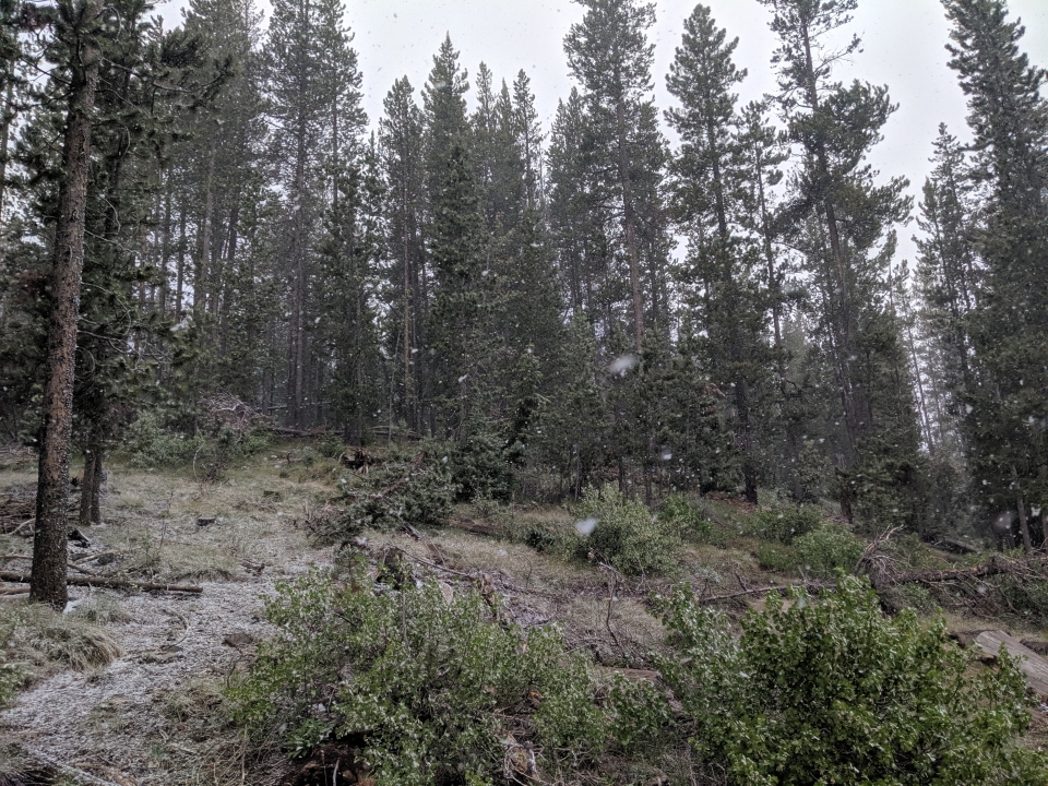Almost as soon as I started, the snow resumed, and it got even colder. I'm woefully unprepared for this. I was still cold even though I was going uphill. On the ensuing downhill, it'd feel a lot colder. But I had to make it down, where it'd be warmer, because there was no way I'd survive a night in a tent up here. Worried about my own personal health and safety, I considered hitchhiking my way out. There's grit, and then there's stupidity.