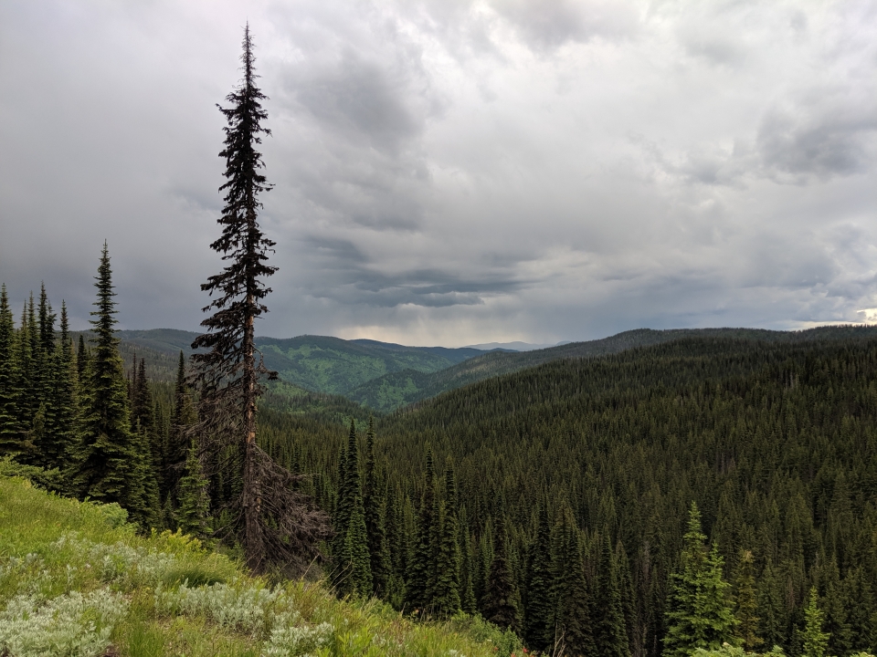 Eventually, the rain began to calm down, and the clouds were lighter behind. By speeding downhill, I'd essentially moved with the rain, ensuring I stayed in it longer. I found a few trees with a thick canopy and waited it out while having a large snack for dinner.
