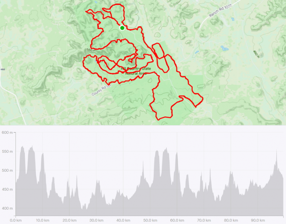 Next up: The Rocky Raccoon 100-miler, in four weeks’ time. The only 100-miler and easily the longest race I plan to do this spring, more than 1.5 times the length of the Bandera 100k. That said, it’s on a much flatter and less technical course than Bandera; many people do the Rocky Raccoon as an introduction to 100-milers, since the course is considerably easier than most, and veterans come out to try to set a personal best. It’s entirely possible that the most difficult race of the series is already behind.