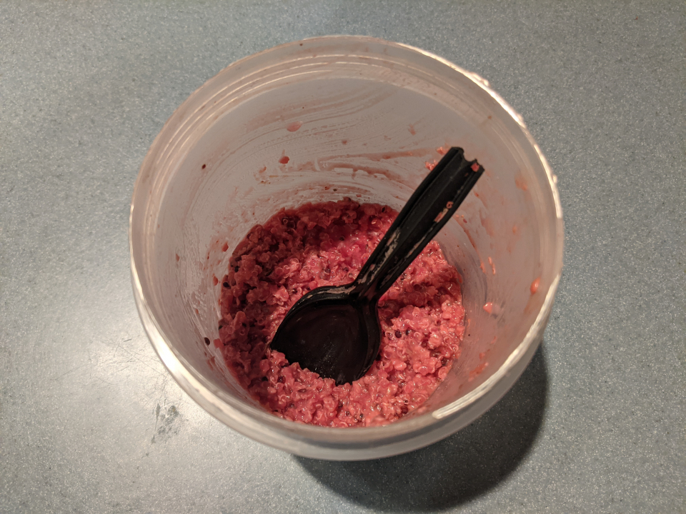 “I call it power oatmeal. It’s basically oatmeal, quinoa, nuts, berries, a couple scoops of sport drink, and beet powder, which makes it purple.”