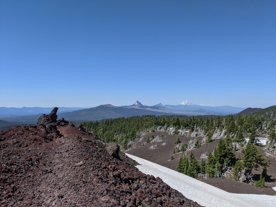 Once we finally got out of the snow, we were nearly past the North Sister, and found ourselves in a field of lava rocks. Initially, we liked the change in landscape, and we were glad to be out of the snow, but that wore off quickly. Lava rocks are a terrible surface to hike on; they’re hard enough to bother your feet, but loose enough that you can’t get a good footing. It’s the discomfort of hiking on sheer rock combined with the difficulty of hiking in sand. And on top of that, the lack of shade in the area makes it hot, and the rocks themselves are noisy!