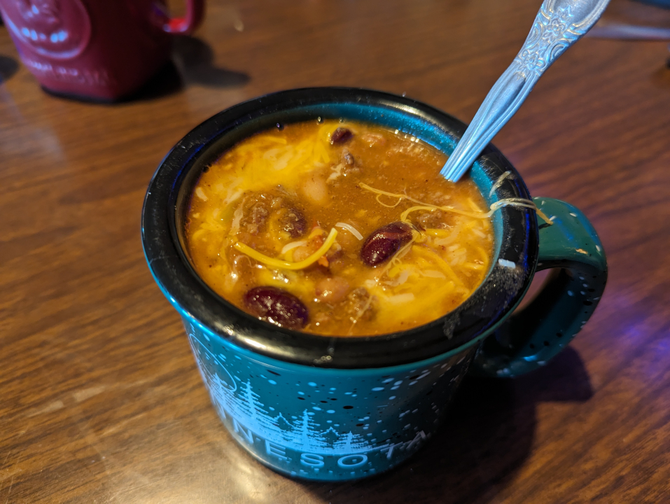 The three of us went to the local dive bar/restaurant in town. I finally had a cup of chili, after missing out on having one in the first three states. I suppose I could still salvage Nebraska and Kansas, but I've failed in my mission to have a cup of chili in every state. For the record, this one was only okay. My own chili at home is much better.