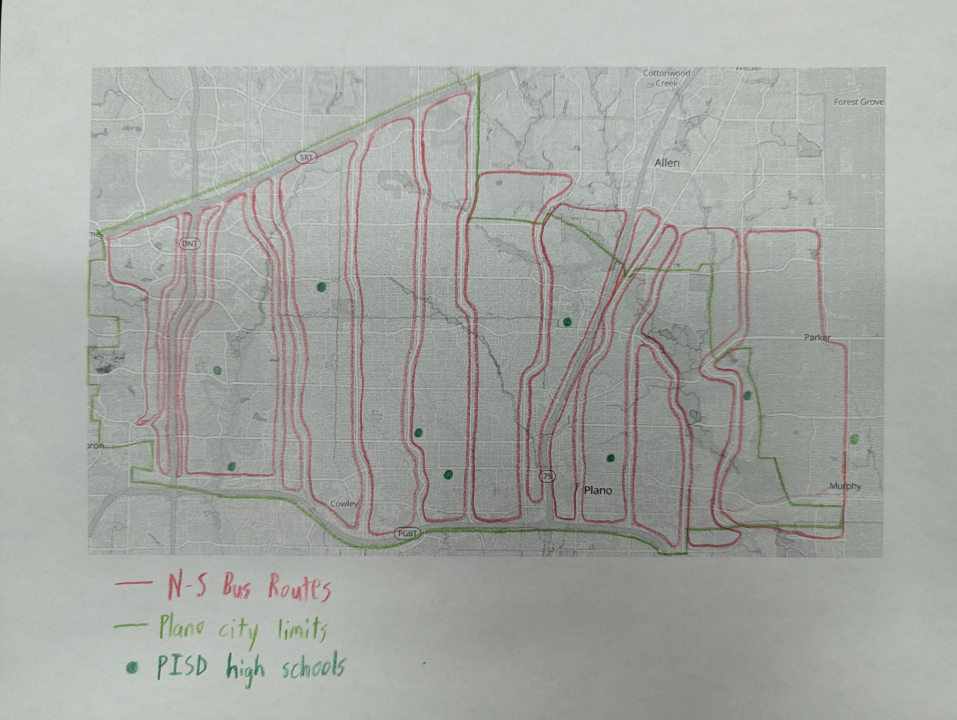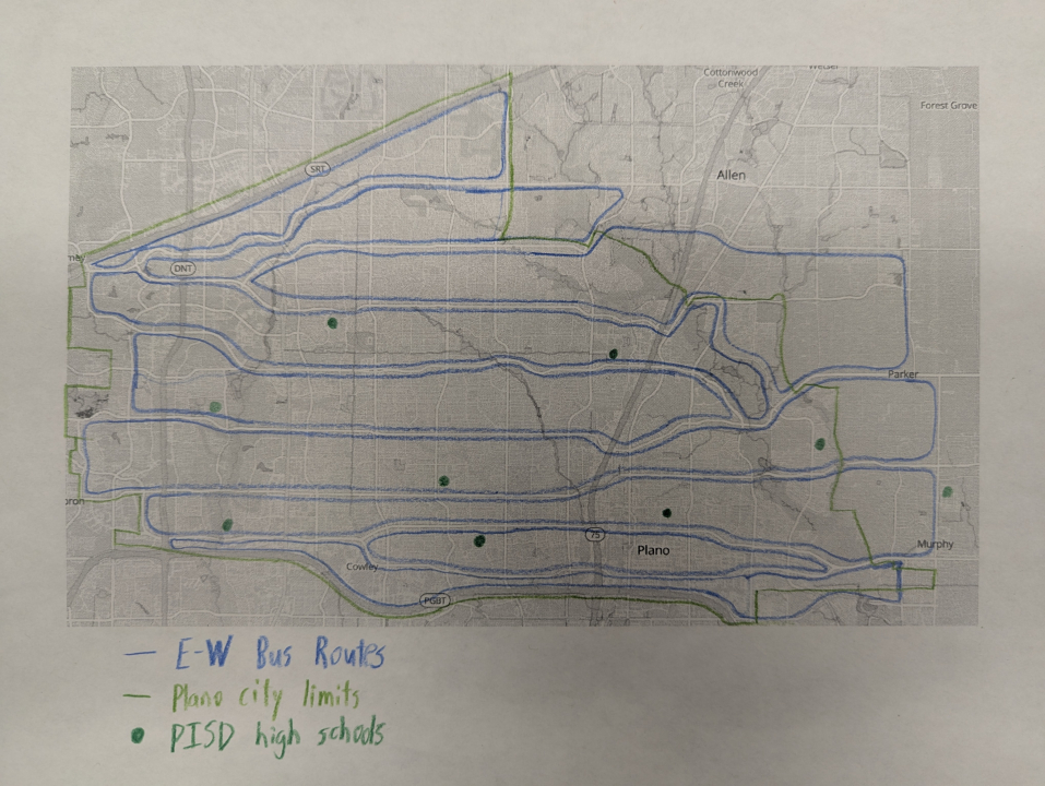 As an example, let’s use the goal of each stop being served by a bus every 15 minutes. If we assume buses move one mile every three minutes, buses would need to be spaced five miles apart. A loop 20 total miles in length (most would be shorter) would need four buses to reach our goal, and if there are 20 such loops (likely less), it would take at most 80 buses to create a citywide system that covers every major road and arrives on 15-minute intervals. Plano ISD already has four times that number of buses.